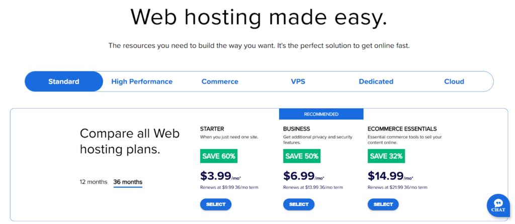 Bluehost Pricing: The prices start at $3.99 per month and come with a free 1-year domain