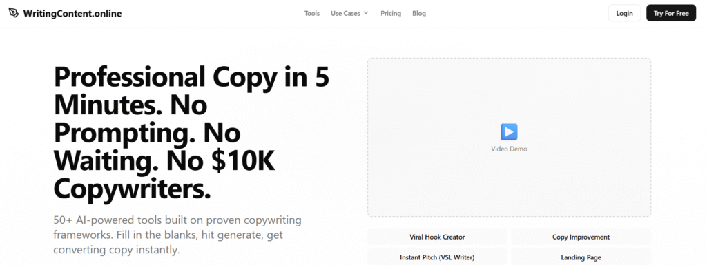 Writing Content makes it easy to create high-quality online content across multiple formats. Whether you need blog posts, social media copy, email campaigns, or other digital content, their platform streamlines the content creation process so you can produce professional materials without the typical time investment or writer’s block.