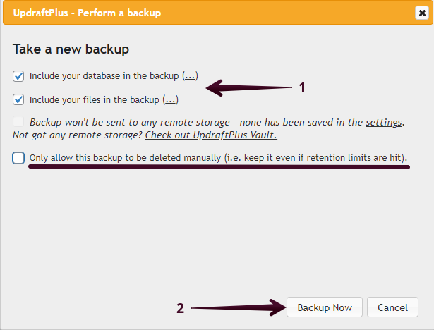 Once you select the type of backup (1) you want, then select Backup Now (2) to start the process: