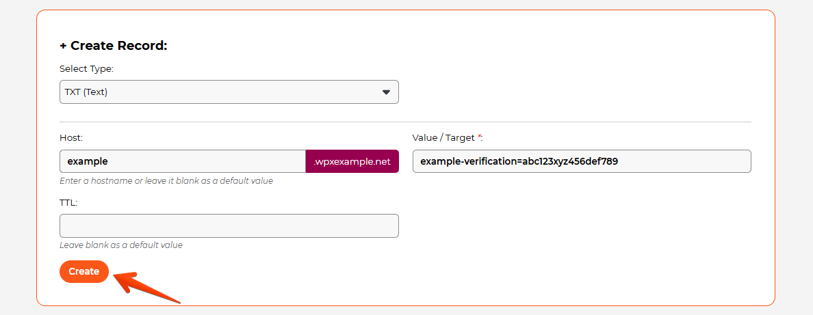 After clicking the +Create Record button, a new setup area will appear, allowing you to add your TXT record.