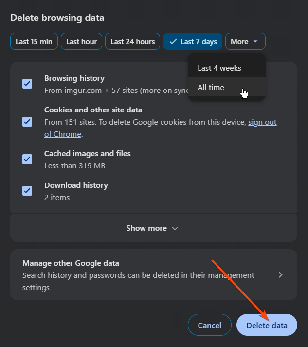 Once you have clicked on Delete browsing data, a pop-up window will appear on your screen. At the top, you will be able to choose the time range. To delete everything, select All time.