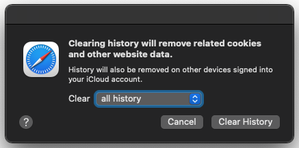 Once you have clicked on the Clear History button, a pop-up window will appear on your screen. Use the drop-down menu to pick what timeframe you want to clear history, cache, and cookies from Safari: