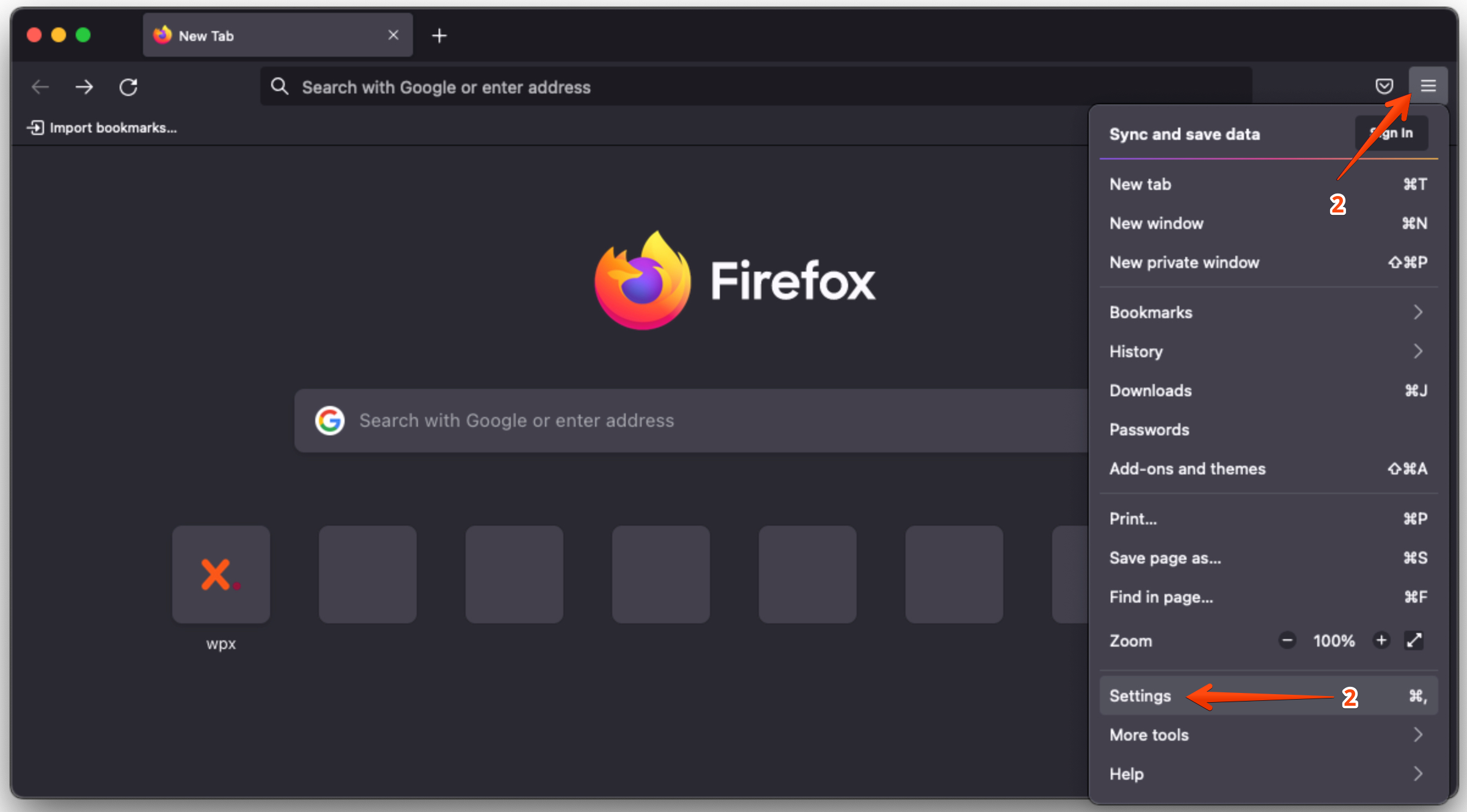 To clear your cookies and cache on Firefox, click the Application Menu button(1), which is located on the top right. After that, you need to click on Settings(2).