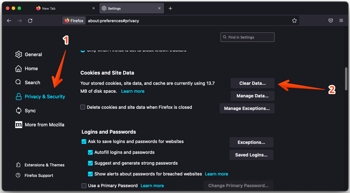 On the left side, you will see Privacy & Security panel(1), click it. After that, in the Cookies and Site Data section, you need to select the Clear Data button(2).