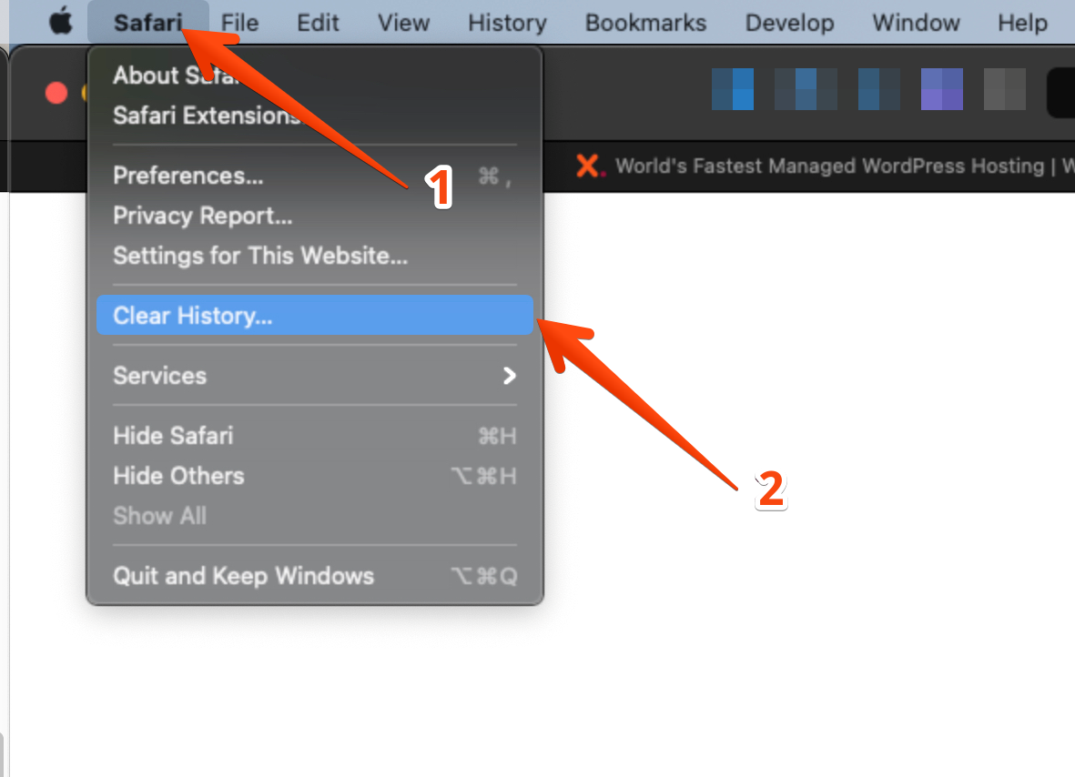 It’s a straightforward process to clear history/cookies and the cache in Safari on your Mac device. You just need to open the browser, in the menu bar, which is located on the top left of your screen, click Safari(1). At the bottom of the drop-down, choose History(2).
