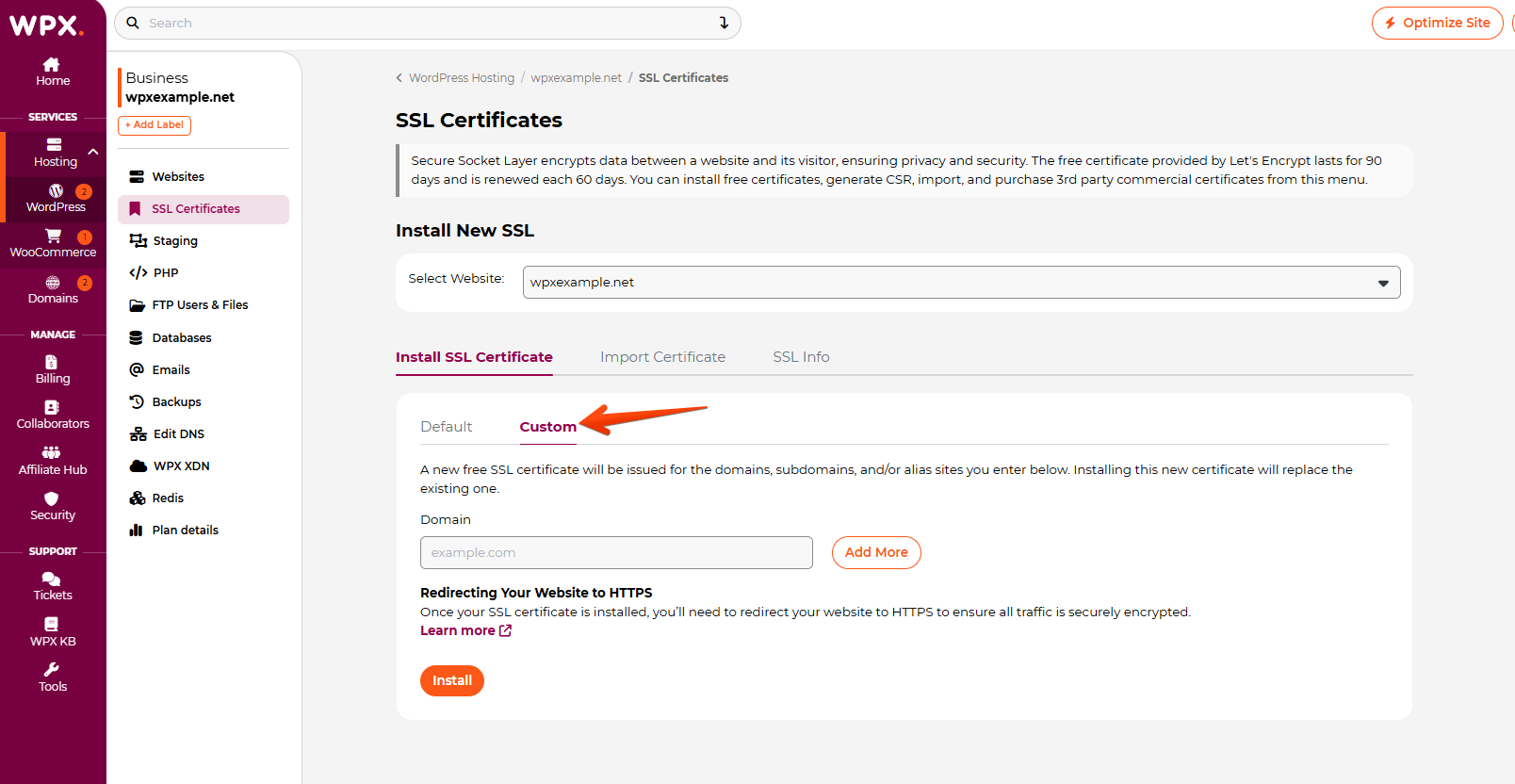 By default, WPX’s free SSL covers both @ (root domain) and www versions. But when installing a custom SSL certificate, you can specify which version(s) to secure.