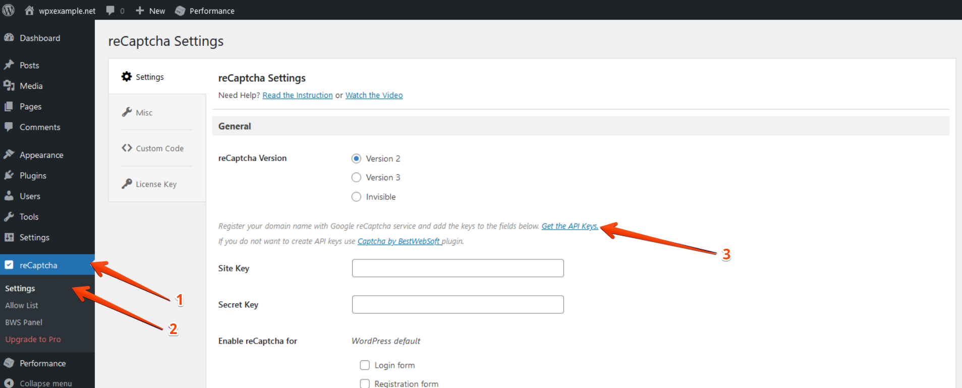 Once you fill in the details, you will be provided with two API keys (Site and Secret key) that you need to copy and paste into the plugin’s settings.
