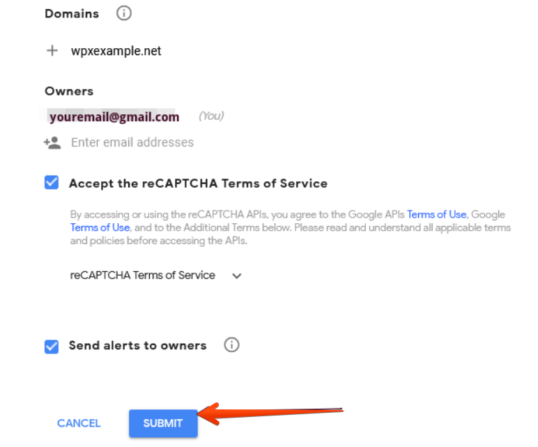 After that, add the domain name that you are setting up. If you want other Gmail accounts to be added as owners and accept the Terms of Service.