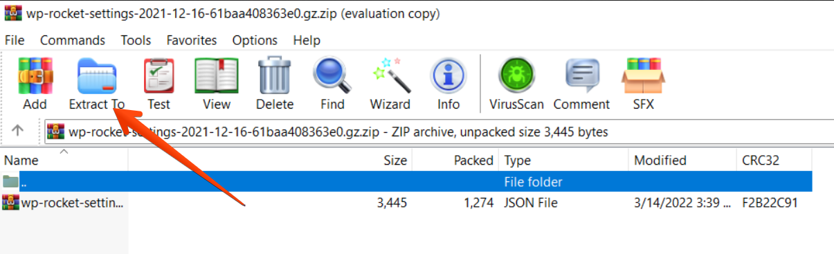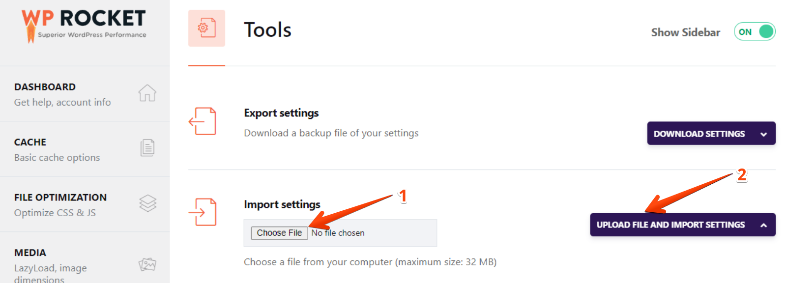 .jsonextension). - In your WordPress dashboard, export your current WP Rocket settings to generate a file.