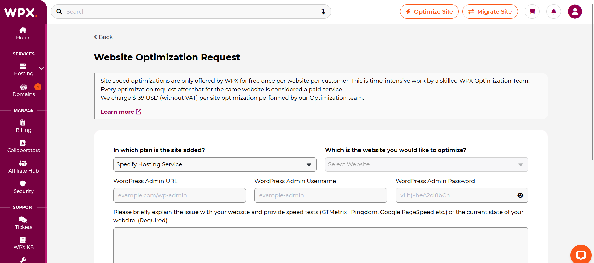 - WordPress Admin Access – Enter the site’s WordPress Admin URL, along with the username and password.