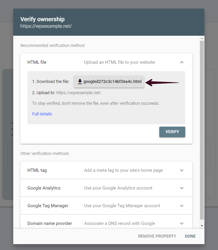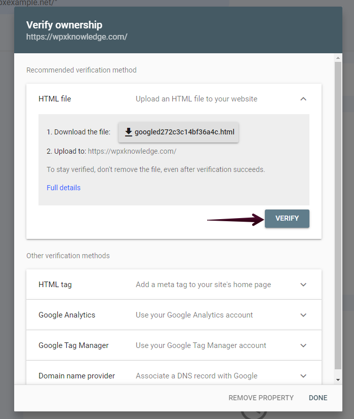 To complete the process of adding a property to your Google Search Console, you need to verify it via one of the methods that are given.