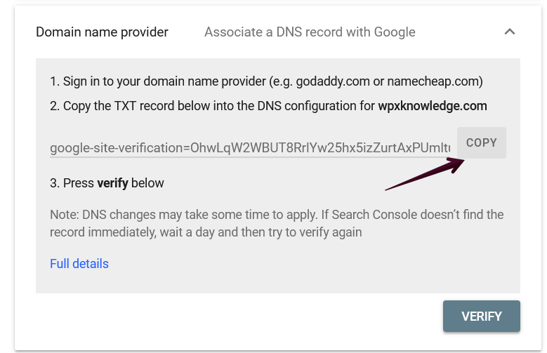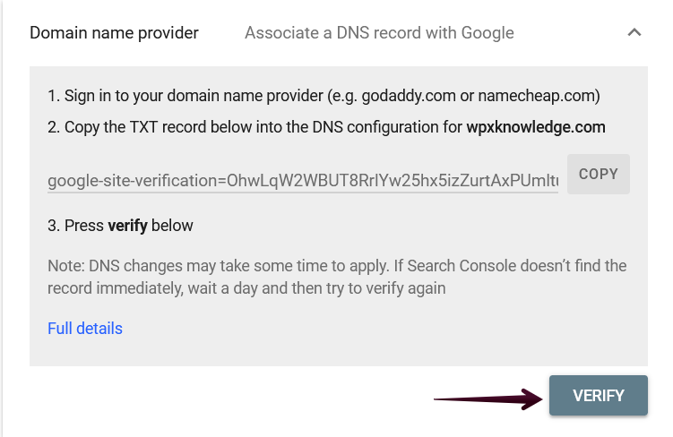 Once the TXT record is uploaded to your DNS zone, you will need to verify it through your Google Search Console to complete the setup: