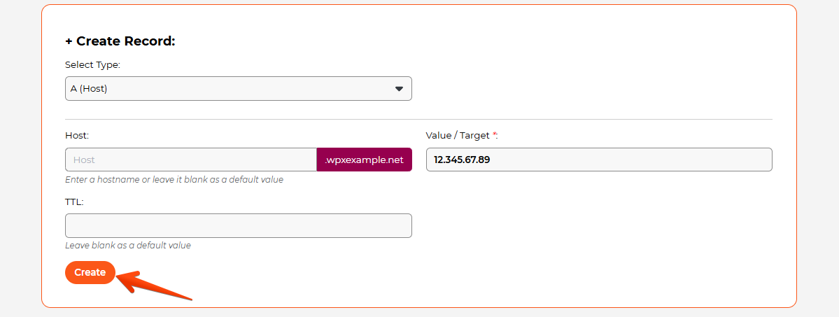 After clicking the +Create Record button, a new setup area will appear, allowing you to add your A record.
