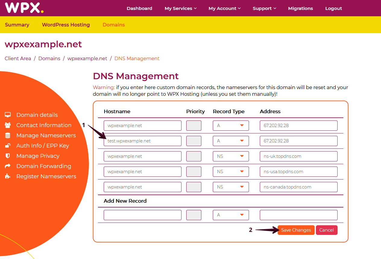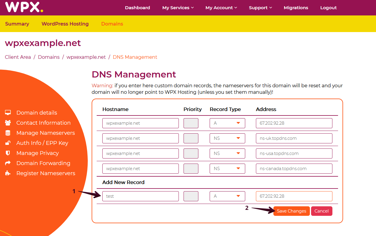 To add a new record, fill in the required information and record type (1) and click on the Save Changes (2) button.
