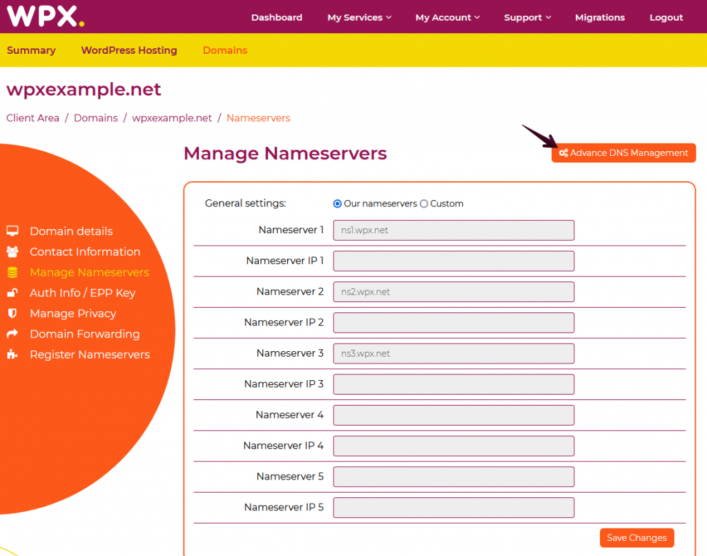 The next page you’ll see after clicking on the Manage Nameservers button is the one below, proceed with the Advanced DNS Management.