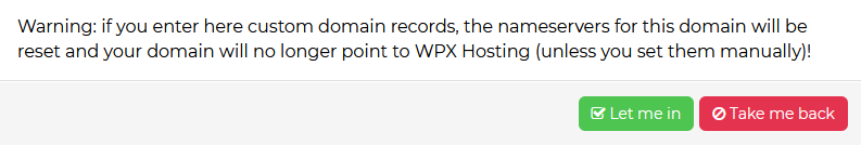 You’ll see the following warning. Make sure to ignore it if your domain isn’t pointed anywhere using NameServers (to a specific hosting service such as WPX). If that’s not the case and your domain is pointed using NameServers, please make sure to select the Take me back button.