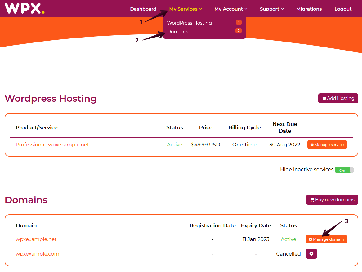 You can either use the My Services (1) → Domains (2) menu option or scroll down and see the list of your domains. You’ll see the Manage domain (3) button, which will take you to the page required for the next steps.