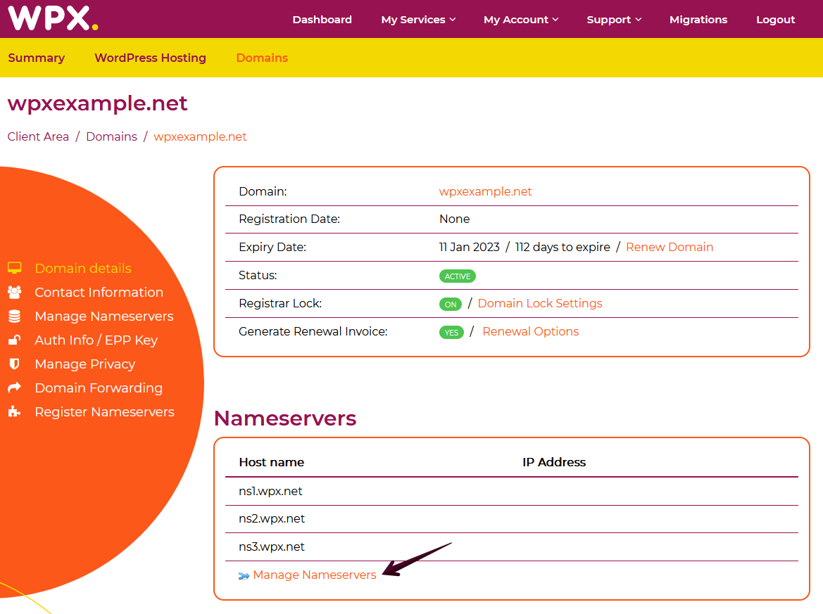 You’ll land on the following page which shows many details about the domain you’ve selected to manage. The Manage Nameservers button will help you both in changing your NameServers or accessing the advanced DNS management to add new DNS records (such as TXT, CNAME, A records, etc.)