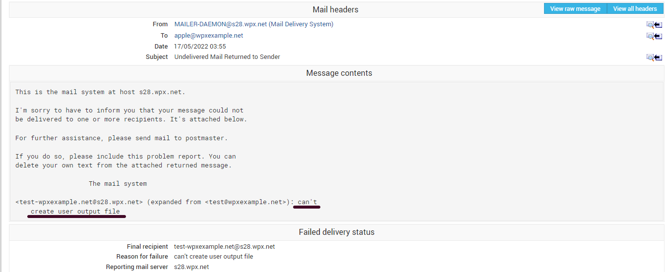 Another message that will indicate the same thing is “Mailbox Quota exceeded“. This error could also indicate that your overall disk space on your WPX Account is full. If you haven’t set a limit on your email boxes, the same solution will apply in this scenario. You will need to clear the email address that is taking up space or limit it to a specific quota.