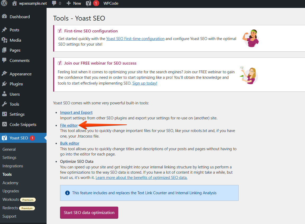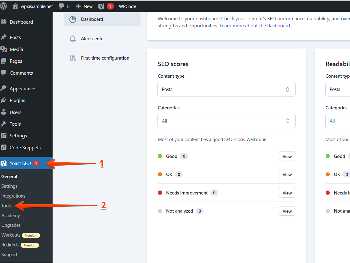 Once installed, navigate through Yoast SEO (1) and choose Tools (2).