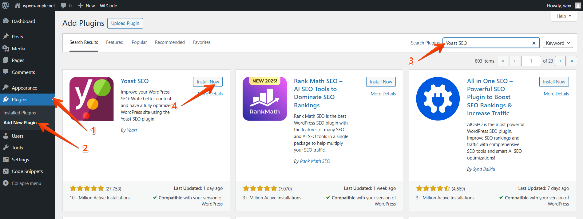 Once you are logged in to your WP Admin, you can go to Plugins (1) → Add New (2). Then enter Yoast SEO into the search bar (3), as shown in the screenshot below. Click on the Install Now (4) button, to begin the installation of the plugin.